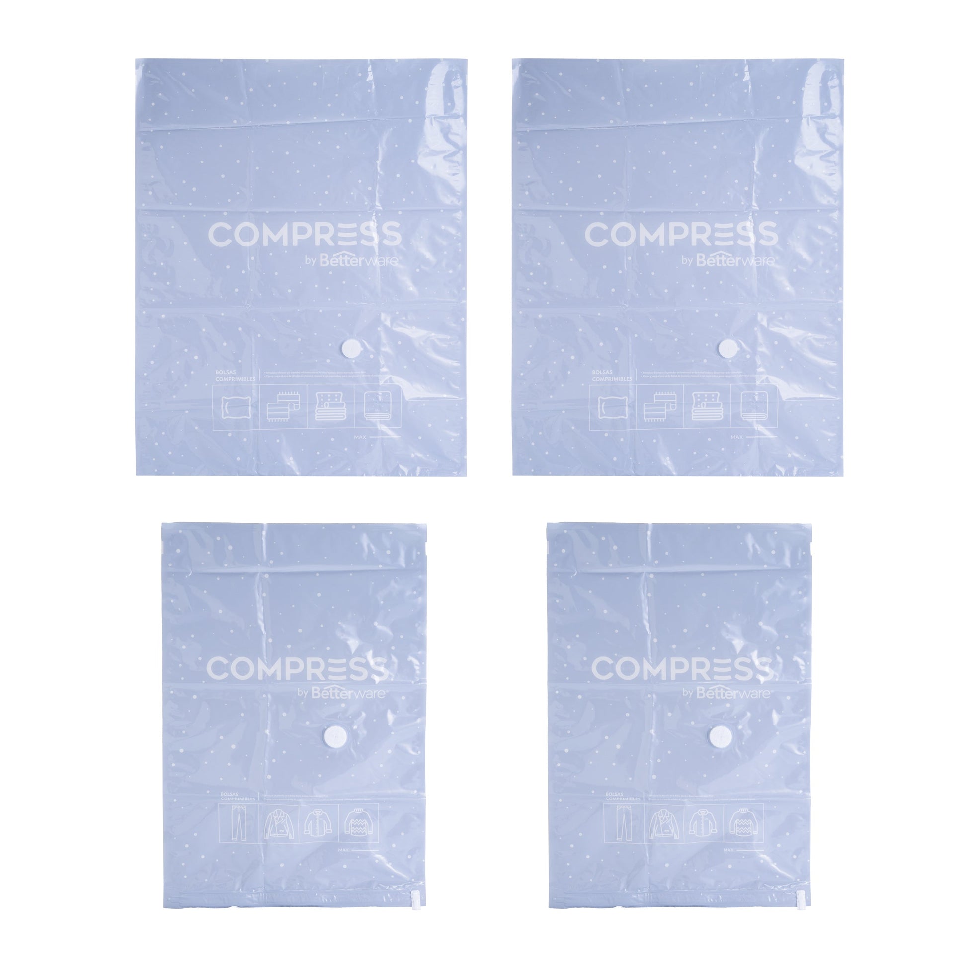 Save space with our 4-piece Compression Bag Set! Perfect for storing bulky winter clothes and bedding, this set comes with 2 large bags, 1 medium bag, and 1 small bag to cover all your bases. Store your comforters, blankets, pillows, pillowcases, jackets, and coats, and see how much room you can save in the blink of an eye! Use them with or without the help of a vacuum and enjoy a newfound sense of spaciousness.