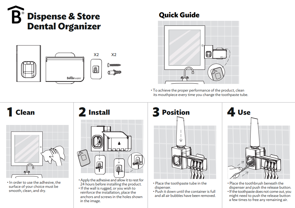 This is the best accessory to organize your family's dental needs! The structure can hold up to four toothbrushes and comes with a dispenser to give you the perfect amount of toothpaste in order to avoid waste. It comes with two installation options: adhesives or screws.