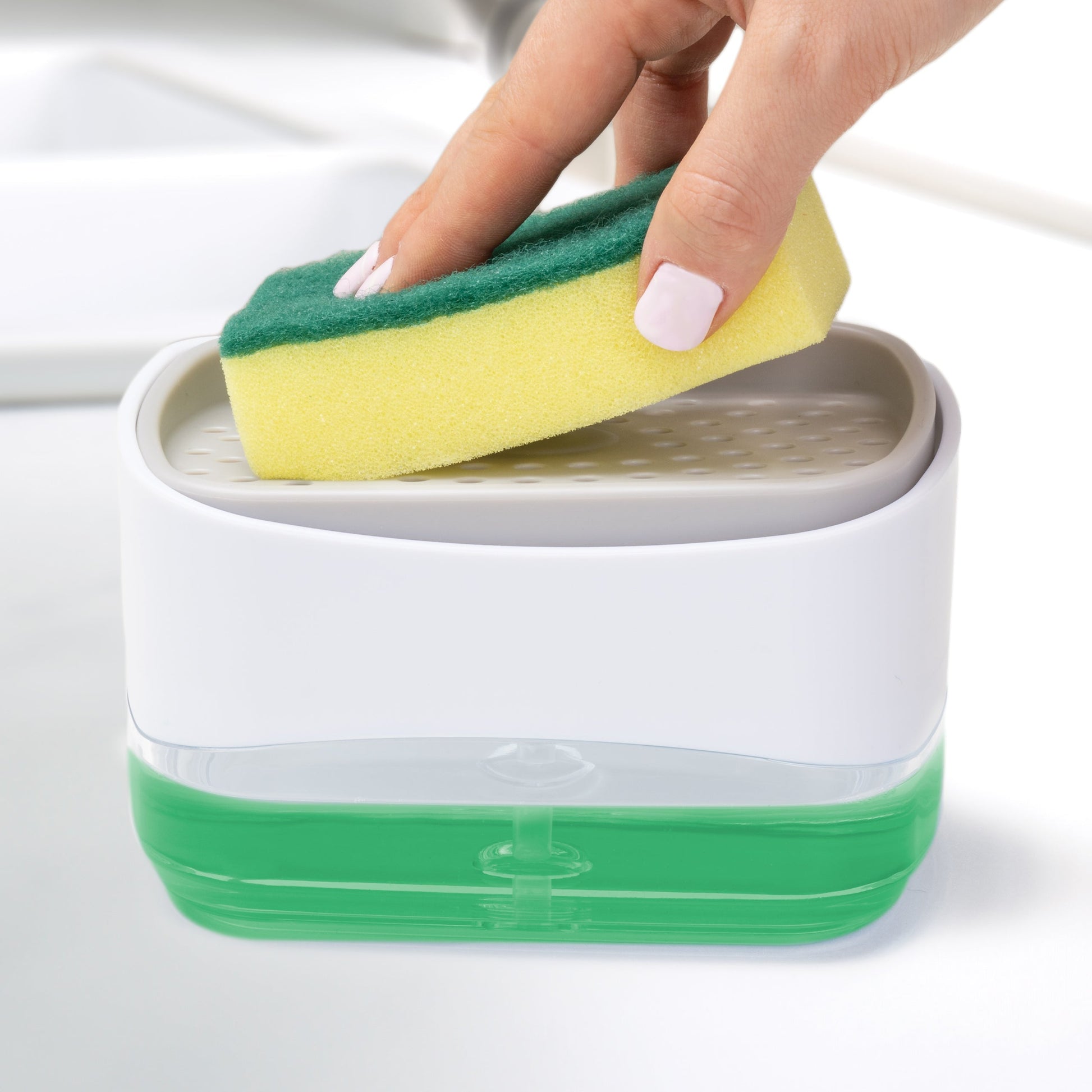 This solution will hold and drain your sponge, as well as dispense soap onto it. Keep your sponge clean and your dish-soap-waste low with one product!